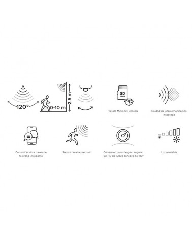 Equipado con un sensor de presencia, el aplique detecta automáticamente la actividad en el área y ajusta la iluminación según sea necesario. Cuenta con una cámara gran angular Full HD 1080p con giro de 180 grados, lo que le permite capturar imágenes de alta calidad en un amplio campo de visión.