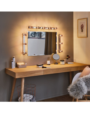 Si eres una diva no puede faltarte este aplique para tu espejo, ideal para sentirte una autentica estrella de la belleza. Si buscas un espejo de Hollywood perfecto en solo unos pocos pasos: simplemente móntalo en la pared encima o al lado del espejo, coloca unas lámparas E14 de tu elección y disfruta de un ambiente como el de un teatro. Incluye interruptor