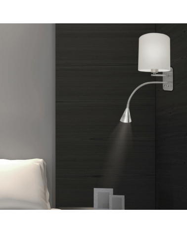 Aplique clásico con pantalla y punto de lectura flexible acabado en metal en níquel satinado, incorpora portalámparas E14 y LED con driver de corriente constante 2-7W 9cA (25-85)V. El LED tiene un brazo flexible que permite situar a nuestro antojo la luz.