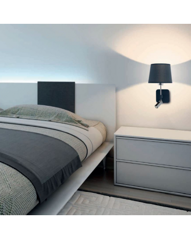 Aplique de pared con dos luces, una de ellas en la parte inferior LED de 3W luz cálida 3000K. Y otra en la parte superior con pantalla disponible en acabado blanco y negro con casquillo E27 con un máximo de 20W. Fabricado de metal acabado en cromo y negro y pantalla textil acabado en negro. Con interruptor de On/Off para facilitar el encendido y apagado. Esta luminaria es también regulable.