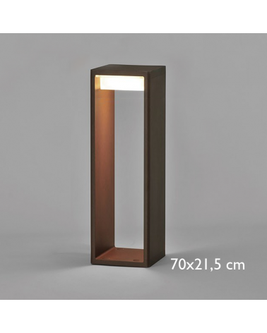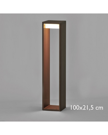 Baliza para exterior (IP54) forma de prisma rectangular hueco. Fabricado en aluminio en acabados en blanco, bronce, gris marengo y corten. Con una altura de 100 cm, temperatura lumínica en 2700K. Ilumina intensamente su vacío interior y asimétricamente el suelo adyacente.