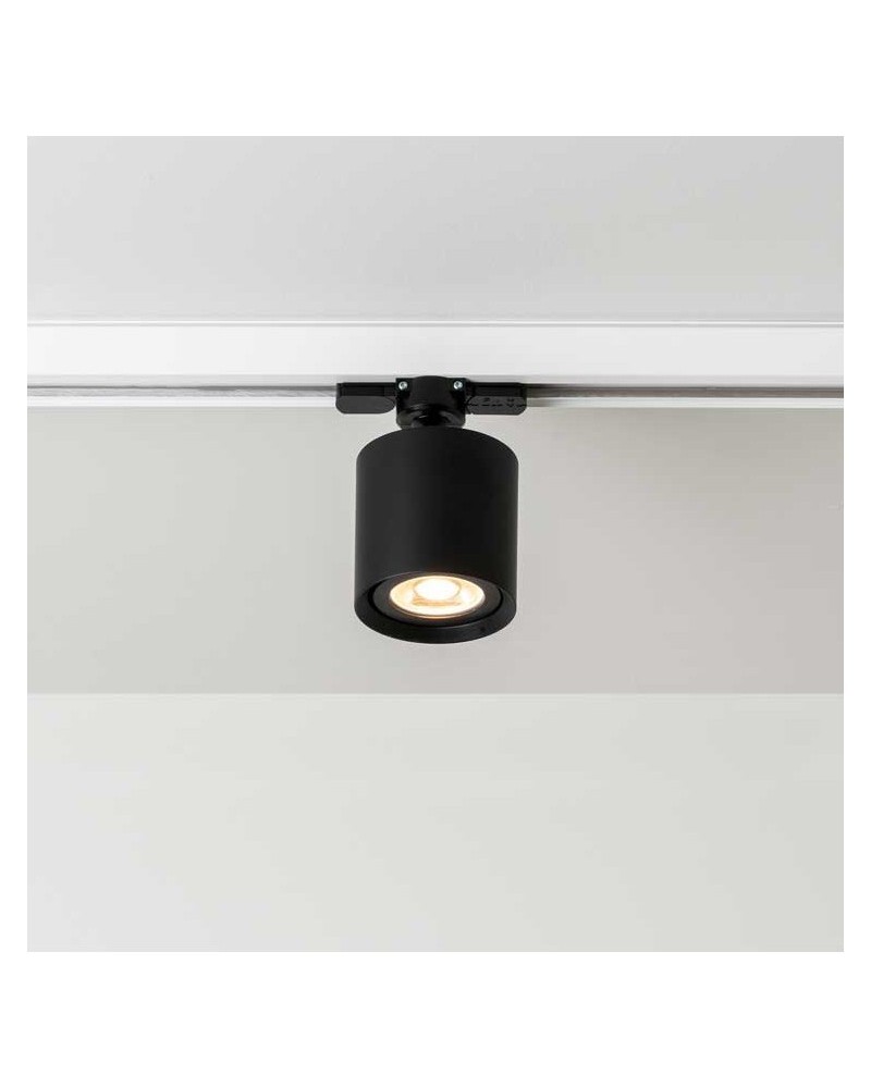 Foco de carril de aluminio orientable en forma de cilindro de 7,7cm de diámetro, disponible en cromo, Negro, Blanco con casquillo GU10, Combinable con otros apliques y focos fijos de la misma colección. Regulable tres pasos posee adaptador monofásico.Fabricado en España.