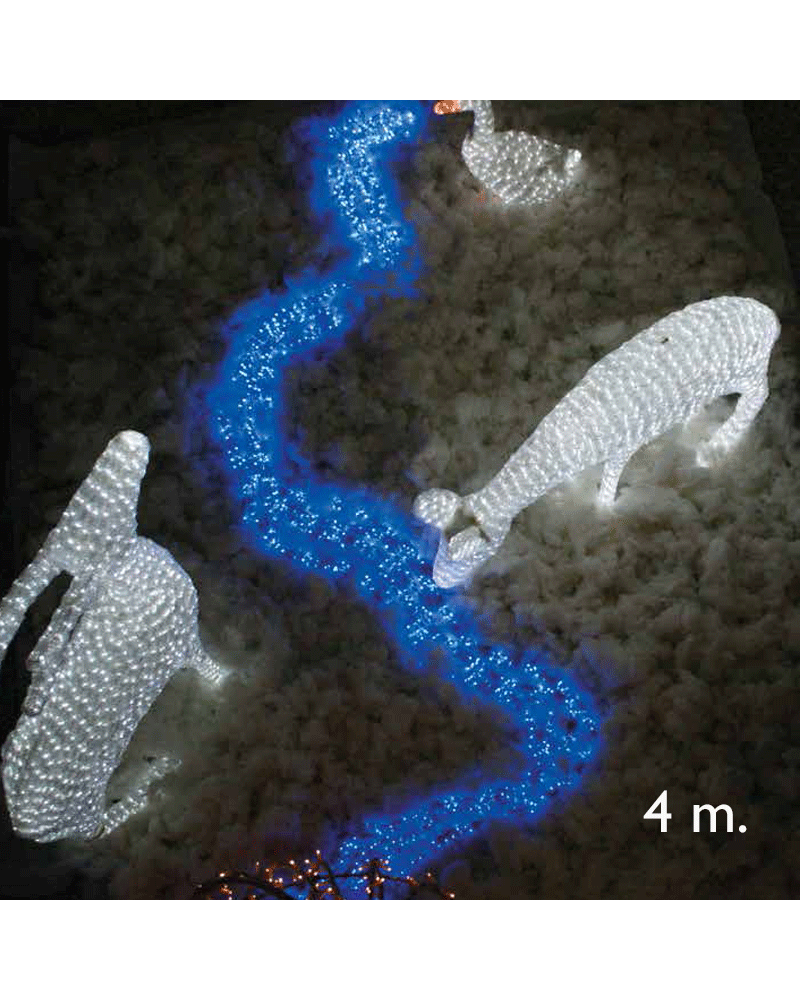 Cascada LED apta para exteriores con 480 leds de luz azul que simula el agua cayendo. Mide 4 metros de altura, más 8 metros de cable de alimentación que incluye transformador y controlador de efectos cascada.
