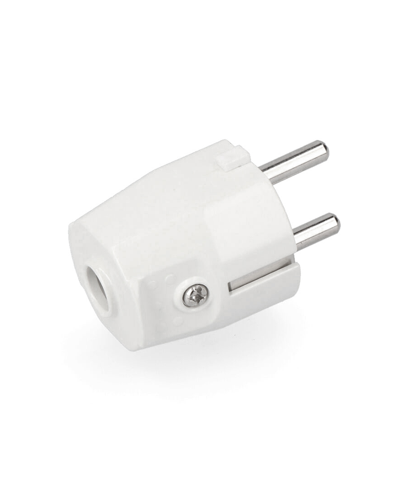 Clavija Schuko 10/16A T/TL 4,8mm. Blanca. Salida de cable frontal.
