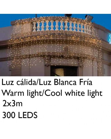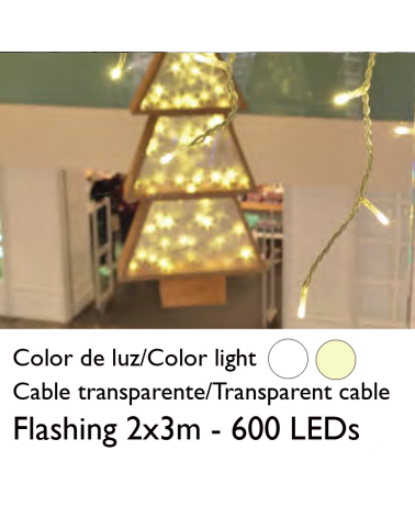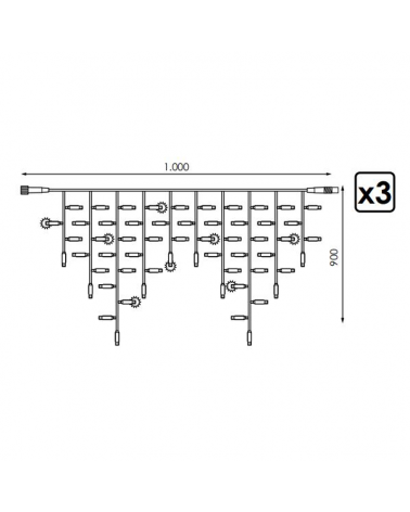 Medidas: longitud de 3 metros; altura 0,9 metros. Lámparas: compuesta por 174 luces LED Número de LED flash: 1 de cada 6 leds son flash Consumo total: sólo 11W Empalmable: se puede acoplar hasta un máximo de 15 cortinas, formando un total de 45 metros con un solo enchufe. Cable de goma Apto para exteriores, IP65. Necesita cable de alimentación 1,50 metros no incluido. Ver referencia 200-17323 (cable blanco).