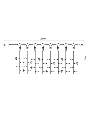 Medidas: largo de 2 metros; altura 1,5 metros. Lámparas: compuestas por 300 luces LED Número de LED flash: 1 de cada 6 LED son flash Consumo total: solo 29W Conectable: se pueden colocar hasta un máximo de 10 cortinas, haciendo un total de 20 metros con un solo enchufe. Cable de goma Para uso en interiores, IP20. Necesita un cable de alimentación de 1,50 metros no incluido. Ver referencia 200-191281 (cable transparente).