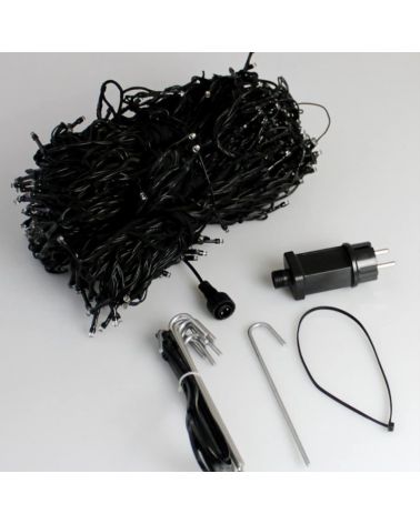 Medidas: longitud de 5 metros; altura 2 metros. Lámparas: compuesta por 120 luces LED Número de tiras: 6. Leds por cada tira: 20. Cable negro. Apto para exteriores, IP44. Incluye transformador.