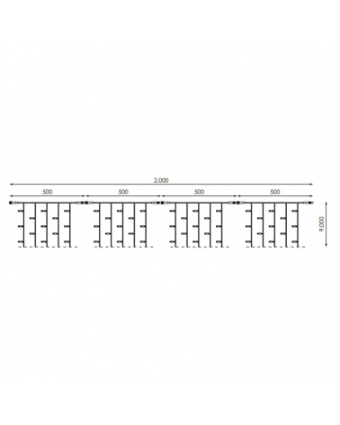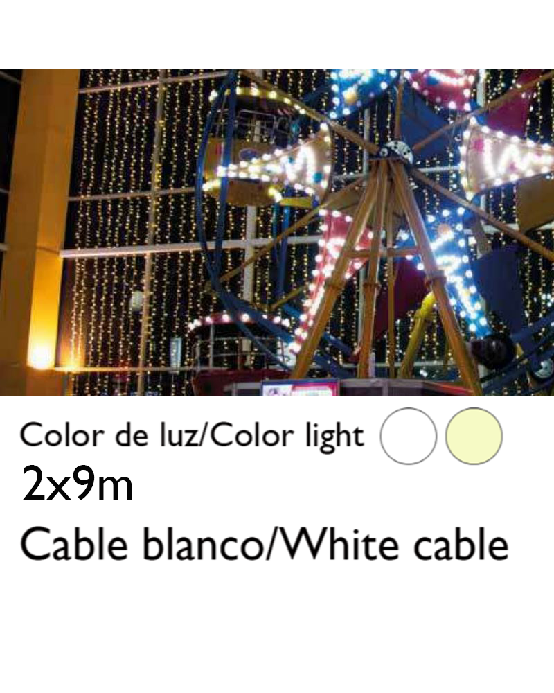 Medidas: longitud de 2 metros; altura 9 metros. Lámparas: compuesta por 900 luces LED. Consumo total: sólo 70W. Cable de goma. Apto para exteriores, IP65. Necesita cable de alimentación 1,50 metros no incluido. Ver referencia 200-17323 (cable blanco).