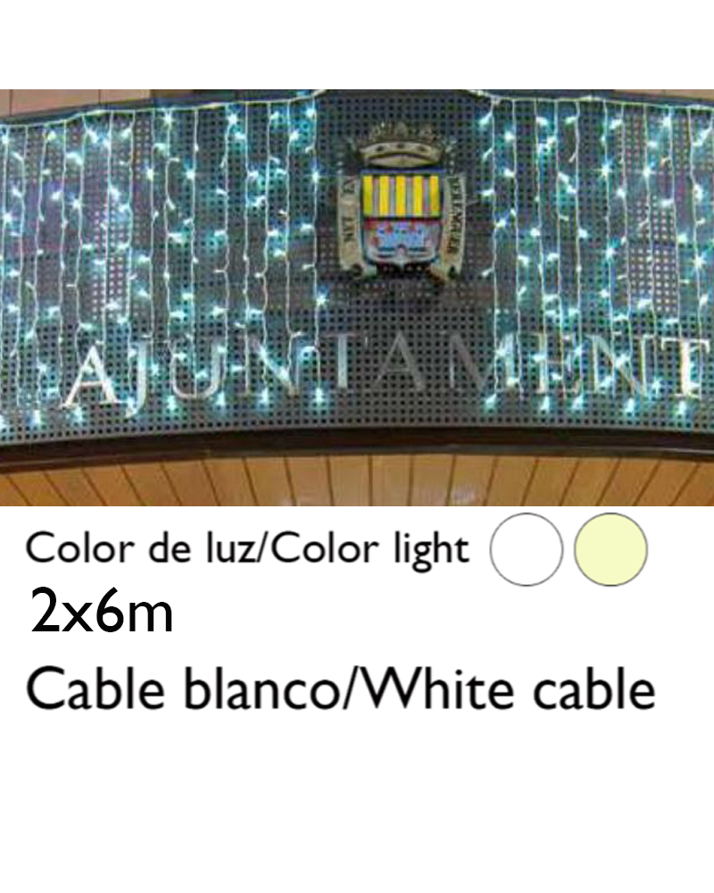 Cortina de luces LED de uso profesional color de luz blanco frío o blanco cálido, cable blanco. Mide 2 metros de largo por 6 metros de alto. Tiene 4 segmentos de 0,50m con un total de 600 luces Led con algunos de ellos efecto flashing, con un total de 20 tiras. Al ser LED consume tan sólo 44W. Es apta para exteriores y empalmable, permitiendo acoplar hasta 3 cortinas juntas con un solo enchufe (3x2 metros).