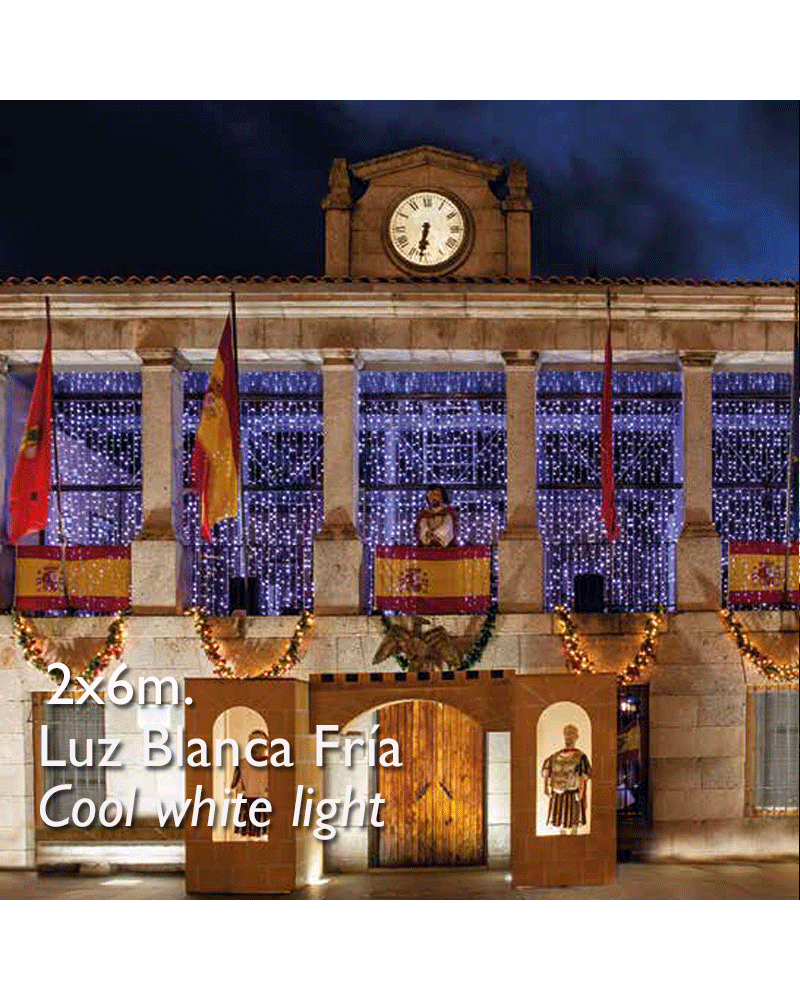 Cortina LED 2x6m Leds blanco frio, cable blanco, cápsula clara, empalmable y apta para exteriores IP65