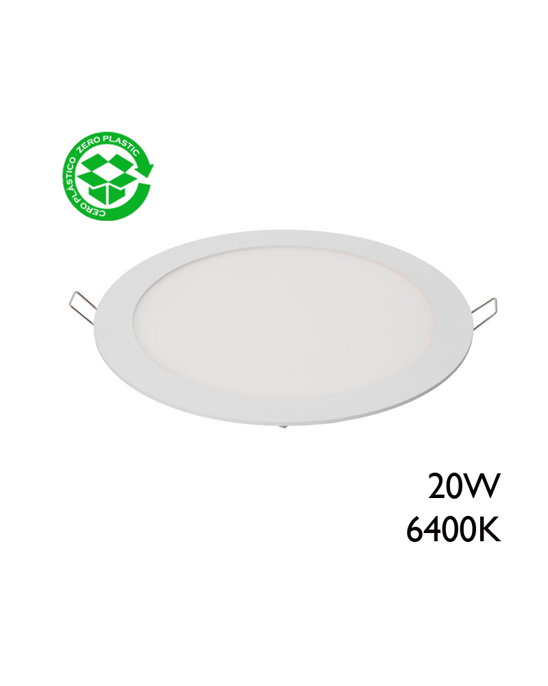 Downlight LED empotrable 20W extraplano de diámetro 22,5cms con marco en color blanco. Luz blanca fría 6400K. Necesita hueco para empotrar de 20x20cm.