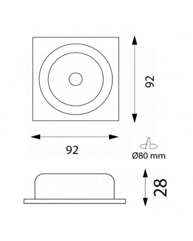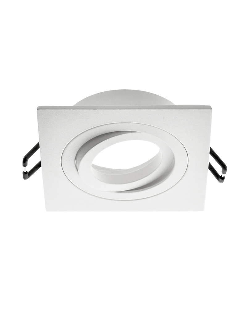 Aro empotrable cuadrado basculante en color blanco, negro y níquel con unas medidas de Ø92x92x28 milímetros, diseñado para la instalación de una bombilla LED dicroica GU10. Incluye portalámparas. Medida de corte: Ø80 milímetros. El modelo en modelo en negro admite agujero de 75 cms