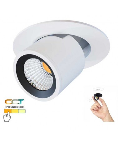 Aro empotrable cuadrado basculante en color blanco, negro y níquel con unas medidas de Ø92x92x28 milímetros, diseñado para la instalación de una bombilla LED dicroica GU10. Incluye portalámparas. Medida de corte: Ø80 milímetros. El modelo en modelo en negro admite agujero de 75 cms