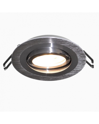 Aro downlight ojo de buey empotrable basculante fabricado en aluminio acabado níquel con unas medidas de Ø92x28 milímetros, diseñado para la instalación de una bombilla LED dicroica GU10. Incluye portalámparas. Medida de corte: Ø80 milímetros.