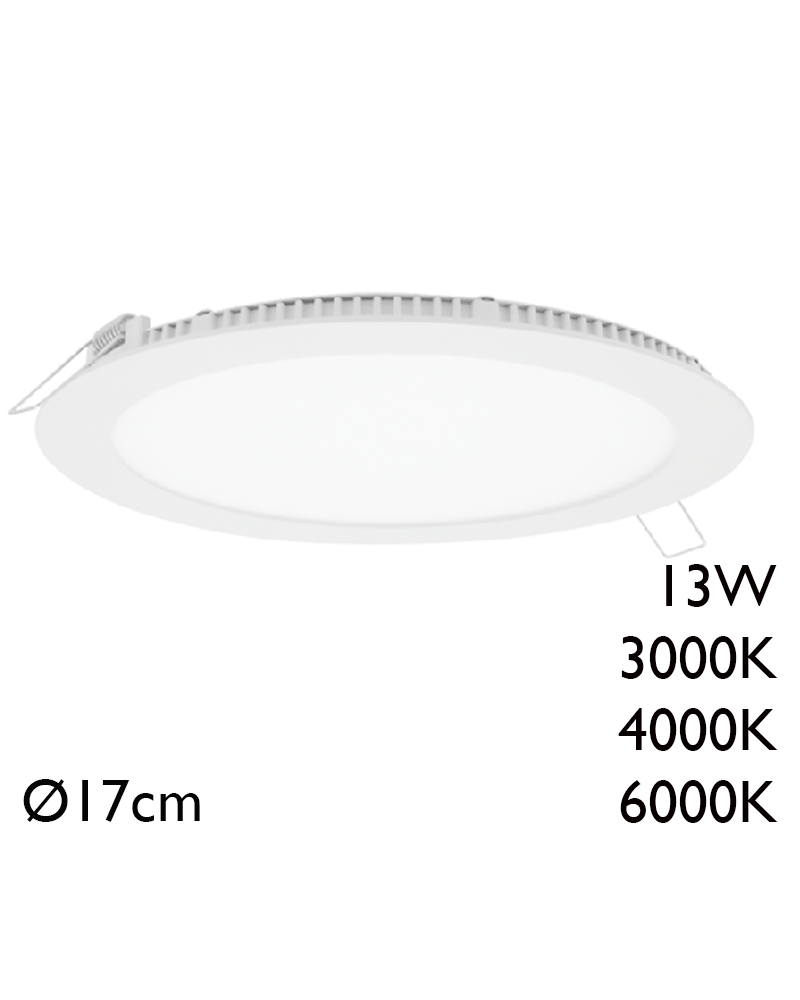 Downlight LED empotrable 13W extraplano de diámetro 17cm con marco en color blanco. Disponible en luz cálida 3000K y luz blanca fría 4000K y luz blanca día 6000K. Necesita hueco para empotrar de 15,5x15,5cm. Este foco empotrable LED es una solución eficiente y estilizada para iluminar su hogar.