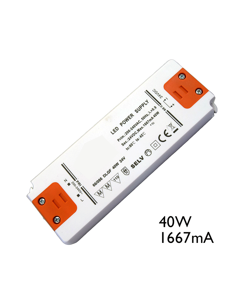 Driver LED de corriente constante 40W 24V 200-240VAC 1666mA para conexión de LEDs Corriente nominal de salida: 1666mA - Tensión nominal de entrada: 200 - 240 V AC - Frecuencia: 50 Hz. - Potencia nominal de salida: 40W Carcasa de policarbonato. Protecciones: térmica, de sobrecargas, sobretensión y cortocircuitos. Dimensiones aproximadas: 159 x 59 x 18 mm IP20. No regulable. Temperaturas: Ta (ºC) 45ºC, Tc (ºC) 80ºC