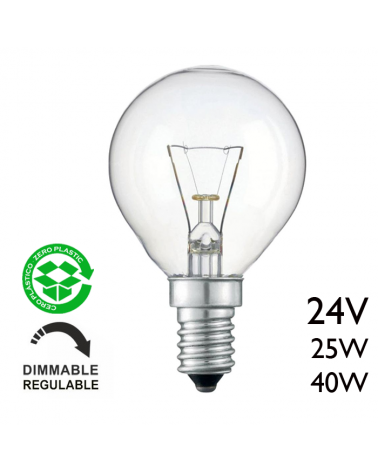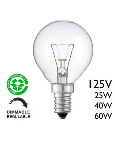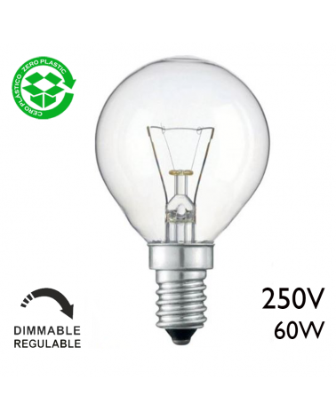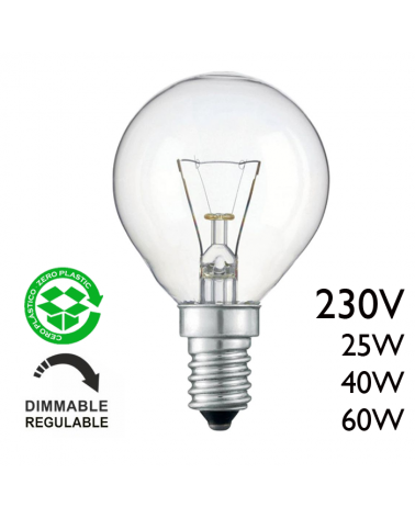 Lámpara incandescente esférica con vidrio mate 230V rosca E14. Disponible en diferentes potencias.