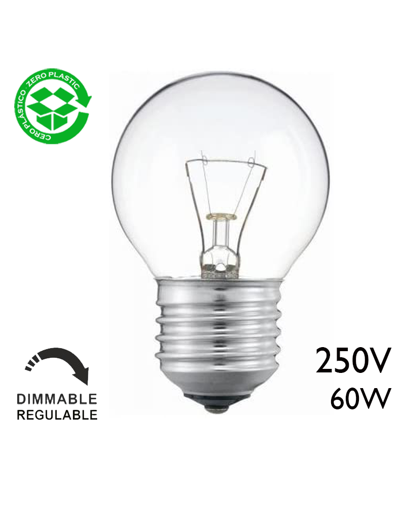 Lámpara incandescente esférica vidrio claro de 250V de tensión rosca E27. Luz cálida 2700K. Regulable. Apta para uso industrial.
