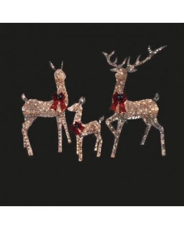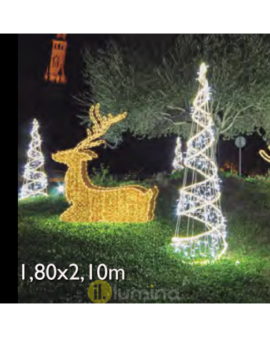 Figura 3D forma de reno sentado medidas 180x210 cms. Iluminado con luces leds blanca cálida. Decorado con tapiz luminoso. Al ser tecnología LED solo consume 90W. Apto para uso exterior, IP65.