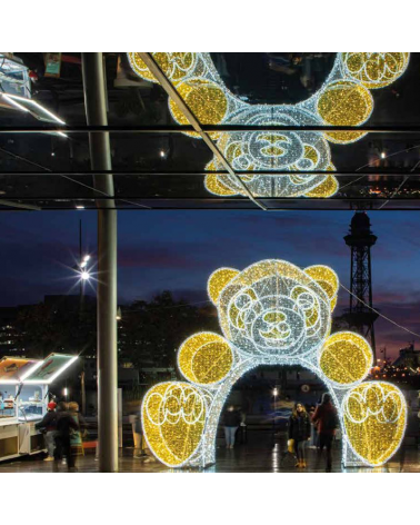 Portal figura de oso gigante transitable 3D medidas 575x480x150 cms. Iluminado con luces leds color blanco frío y blanco cálido. Con tapiz PVC. Al ser tecnología LED solo consume 750W. Apto para uso exterior, IP65.