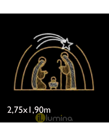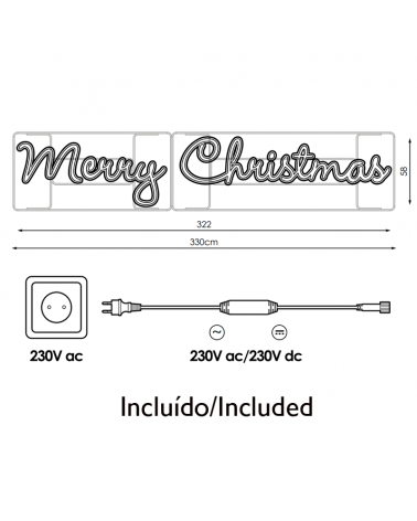 Ideal para fachadas, decorar calles, farolas, balcones, adornar finales de guirnaldas, etc. - Cable de alimentación incluído. - Medidas figura luminosa: largo 330 cms, altura 66 cms. Peso: 10 Kgs. - Tipo bombilla: tecnología LED. - Consumo total: sólo 60W. - IP65: Apto para uso exterior. - Tensión: directo a red 230V.