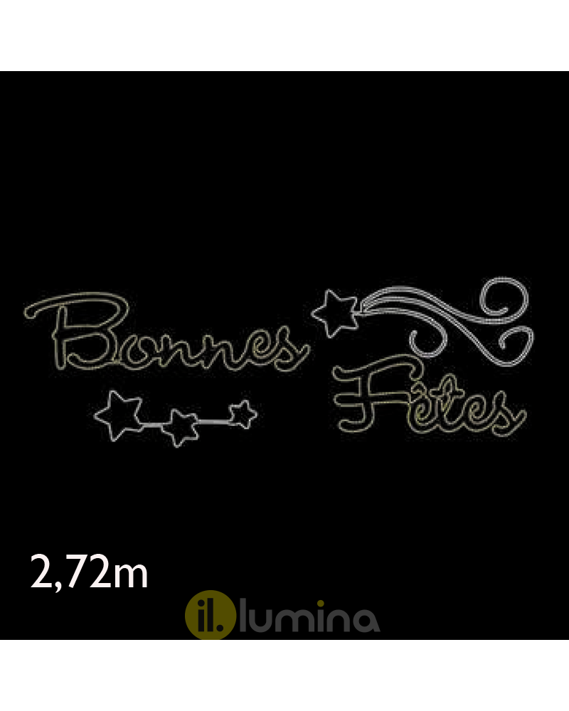 Cartel de leds "BONNES FÊTES" con decoración cometa de 2,72 metros de largo iluminada con leds luz blanca fría y blanca cálida. Al ser tecnología LED solo consume 81W. Apto para uso exterior, IP65 & IP44 Plug. Fabricado en España.