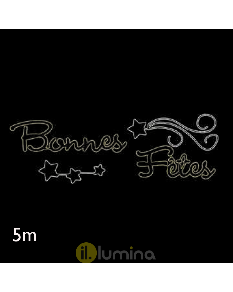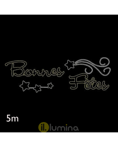 Cartel de leds "BONNES FÊTES" con decoración cometa de 5 metros de largo iluminada con leds luz blanca fría y blanca cálida. Al ser tecnología LED solo consume 165W. Apto para uso exterior, IP65 & IP44 Plug. Fabricado en España.