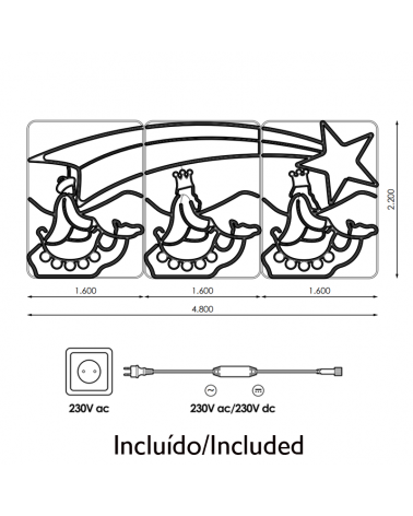Figura luminosa navideña realizada con estructura metálica y con tubo luminoso LED en forma de Reyes Magos con camellos, iluminada en luz blanca fría y blanca cálida. Tamaño: 480x220 cms. Alta protección IP65: apta para uso exterior. Bajo consumo: al ser LED consume solo 306W. Directo a red 230V. Fabricado en España. Peso: 28 Kgs. Ideal para iluminar fachadas.