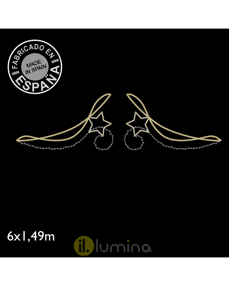 Composición formada por dos unidades de 200-3-1886 Figura decorativa de alumbrado de Navidad, apto para fachadas, farolas y calles. Con luz LED en color blanco frio y blanco cálido. Al ser tecnología LED solo consume 126W. Apto para uso exterior, IP65 & IP44 Plug.