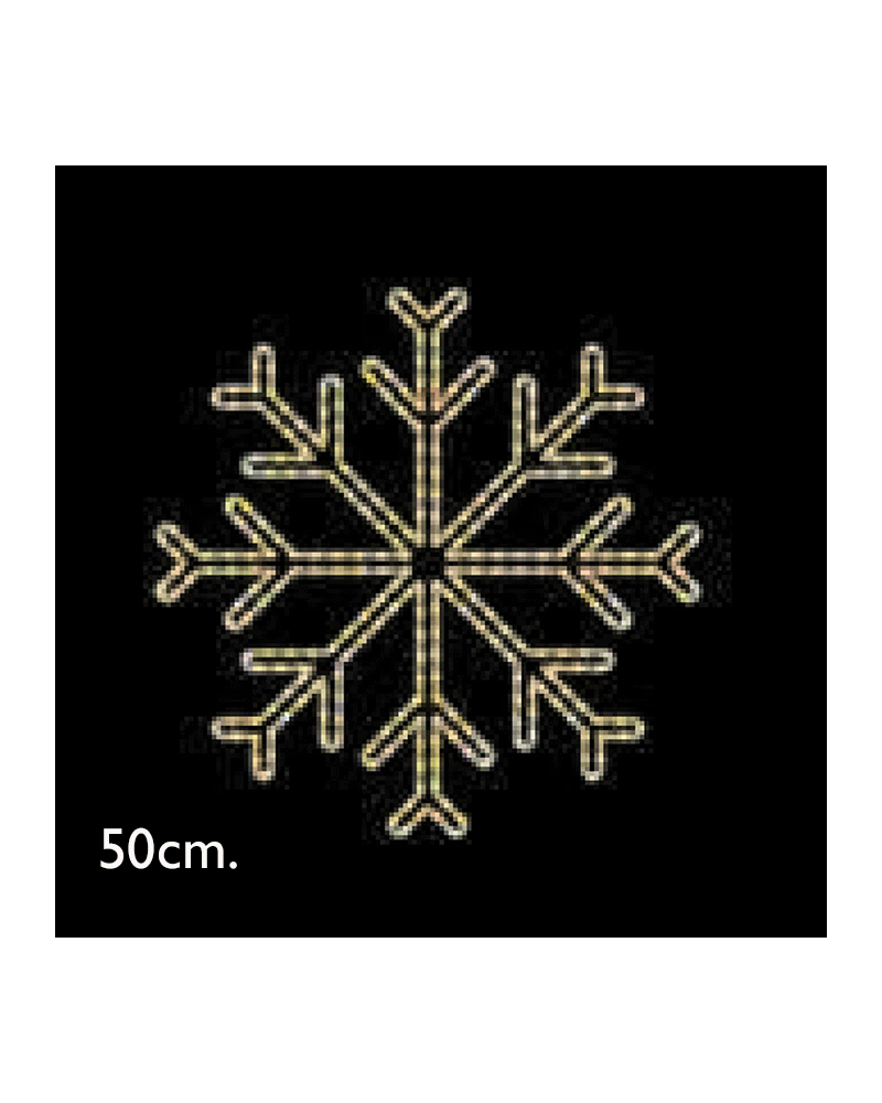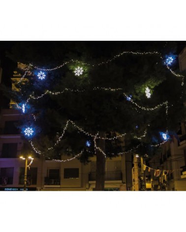 Motivo navideño en forma de copo de nieve tipo estrella de 50 cms de diámetro con luces LED disponible en luz fría, luz cálida y luz azul. Apto para uso exterior, IP65 & base enchufe IP44. Ideal para decorar fachadas, o adornar finales de guirnaldas, calles, etc. Cable de alimentación incluido. Voltaje 230V. Consumo: tan solo 15W.