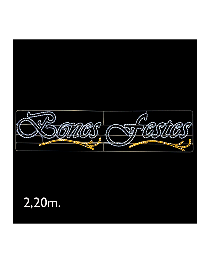Cartel de leds "BONES FESTES" de 220cms iluminado con leds de colores blanco frío, con las palabras subrayadas en leds cálidos. Mide 2,2 metros de largo. Al ser tecnología LED solo consume 62W. Apto para uso exterior, IP65 & IP44 Plug