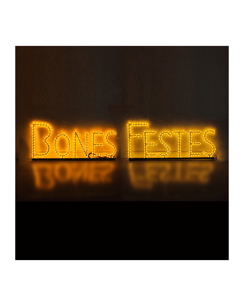ÚLTIMA UNIDAD !! Figura luminosa realizada con tubo luminoso " BONES FESTES ", iluminado con luz amarilla. Tamaño: cada palabra mide 39x100 cms. Apto para uso exterior.