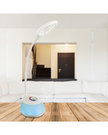 Lámpara de mesa de policarbonato blanco de 48 cm. Con un brazo flexible, una luz blanca fría 5500K de 160Lm. La base se ilumina mediante un cambiador de color que puede fija los colores, un atenuador táctil y un toque para encender y apagar. Incluye un cable de carga USB de 150 cm y una batería de 800 mAh.