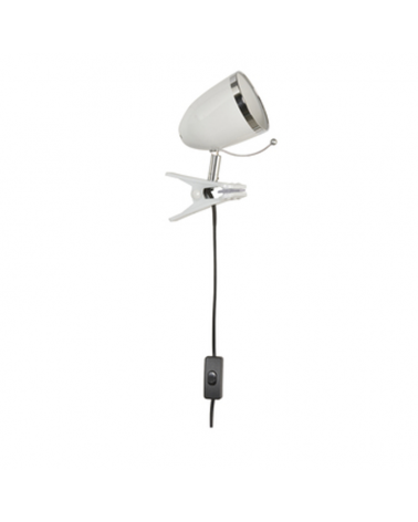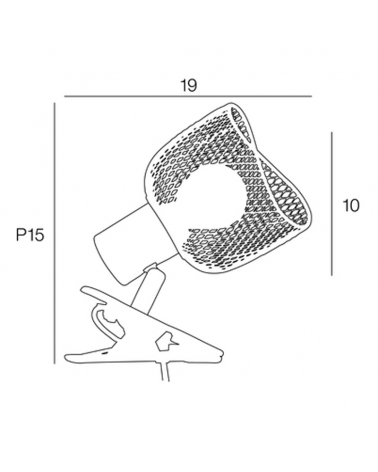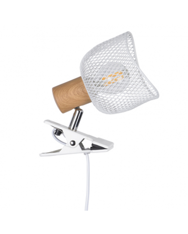 Foco articulado con pinza con una pantalla de rejilla metálica negra con cabezal efecto madera, disponible en acabado blanco o negro. Abrazadera de plástico la cual permite su colocación en muebles u otros objetos, llevando la luz a donde tú quieras. Pinza robusta mantiene la luminaria firmemente en su lugar y a la vez no daña el material al que está fijada. Al estar realizada con rejilla de metal se hacen visibles las bombillas de manera que se podrían elegir unas bombillas decorativas haciendo la luminaria más atractiva. Bombilla no incluída.