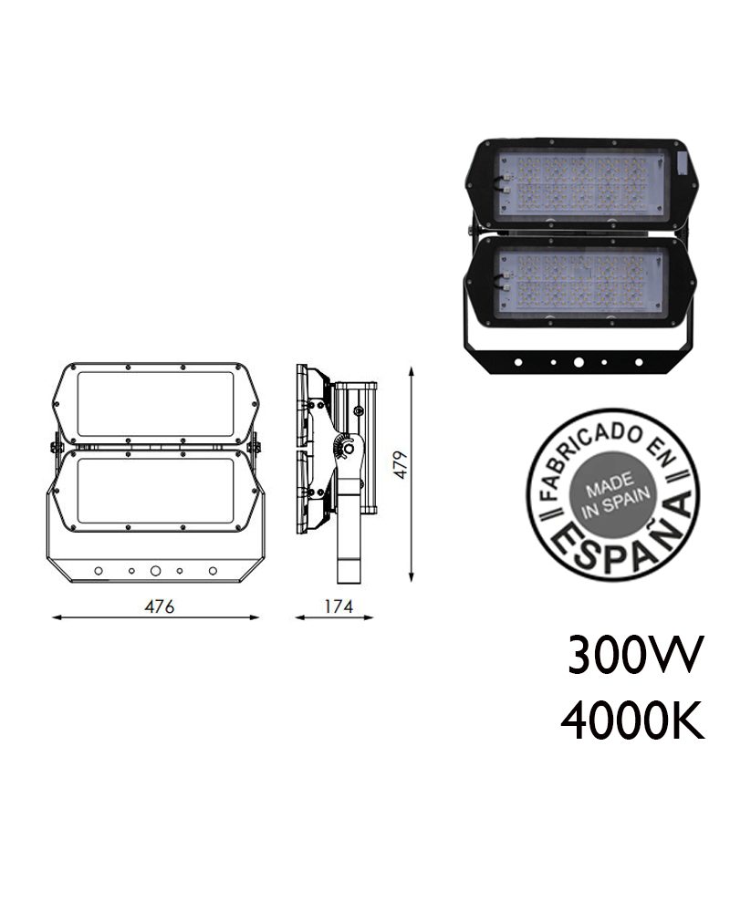 Proyector industrial de 300W, 4000K y bajo pedido en luz cálida 3000K o luz blanca día 5000K IP66 de alta luminosidad. Con una intensidad de 1000mA. Fabricado en aluminio iap y difusor de policarbonato transparente. Tiene una larga vida con mas de 100.000 horas. Fabricado con materiales de alta calidad diseñado en España. Regulable mediante sistema Dali. Dispone de tecnología HCB, TESS, OVERSTORM y SYSTEMSHIELD.