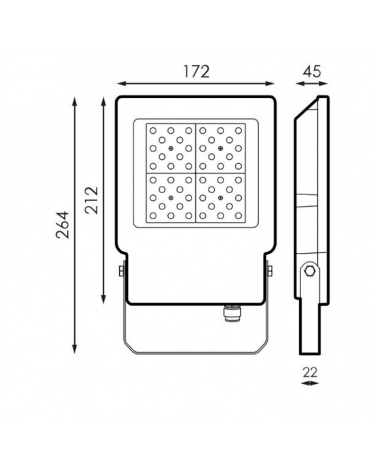 Proyector de exteriores 33W IP65 de muy alta luminosidad. Acabado: Gris RAL 7010. Cuerpo en aluminio y difusor de vidrio templado transparente. Ángulo de luz: 90º. Índice de reproducción cromática: >70. Frecuencia: 50-60Hz. Índice contra impactos: IK08. Clase I.