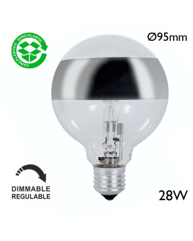 Las bombillas mitad espejo mitad cristal son altamente decorativas y reflectantes. Son ideales para espacios amplios combinando varias a la vez, ya que crean una combinación perfecta de luz y reflejos. Perfectas en apliques de pared con portalámparas E27. Bombilla ECO halógena de 42W (consume 42W pero da luz equivalente a 60W) Ahorro 30% y luminosidad: 415 Lm.