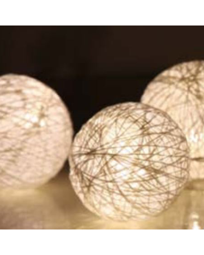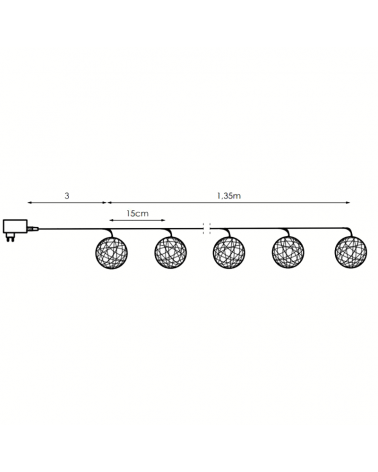 Guirnalda de 10 bolas de algodón de 6cm de diámetro cada una y luz cálida de 4,35 metros de longitud y una distancia de 15cm entre bolas. Al ser LED consume tan sólo 0,64W y 3,2V.