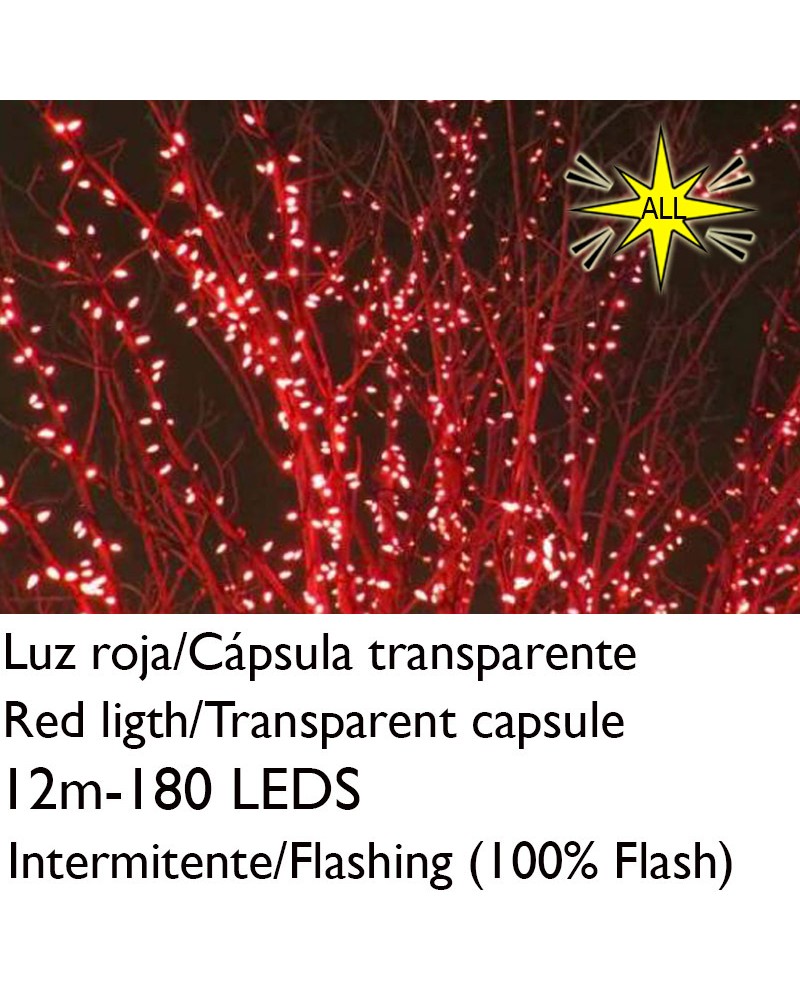 Guirnalda 12m y 180 LEDs Intermitente luz roja cápsula clara cable rojo empalmable IP65 apta para exterior