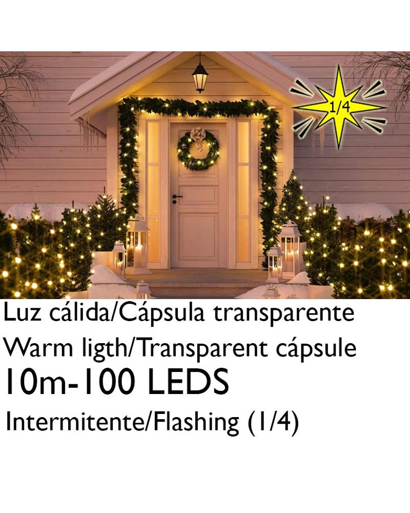 Guirnalda de 10 metros de longitud, empalmable, con 100 luces LED, luz cálida. Cápsula clara, disponible en cable blanco o verd2. Se puede empalmar hasta 100 metros con un solo enchufe. Está formada por 3 segmentos de 5m con 50 leds, 10 de ellos efecto intermitente.