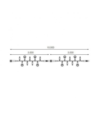 Cada guirnalda está compuesta por 2 segmentos de 5 metros, y además son empalmables, por lo que puede hacer la combinación que crea necesaria. - Medidas: longitud de 10 metros. - Lamparas: compuesta por 100 luces LEDS, 50 Leds por cada segmento 10 de ellas efecto intermitente. - Consumo total: sólo 8W. - Consumo por segmento 5m: 4W - Empalmable: se puede acoplar hasta un máximo de 100 metros con un solo enchufe. - Cable de goma color blanco o verde. - Apto para exteriores, IP65. - Cápsula de policarbonato clara.