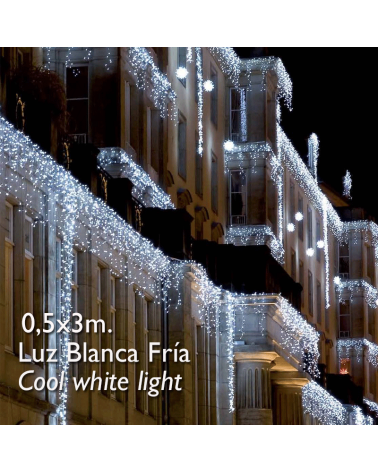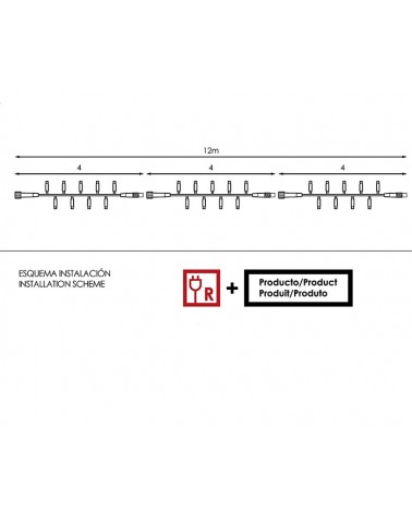 Guirnalda de 12 metros de longitud, empalmable, con 180 luces LED, cápsula clara. Se puede empalmar hasta 10 cortinas (100 a 120 metros en total) con un solo enchufe. Está formada por 3 segmentos de 4m con 60 leds, que pueden funcionar de forma independiente. Apto para exteriores (IP65). Disponible en cable verde o blanco.