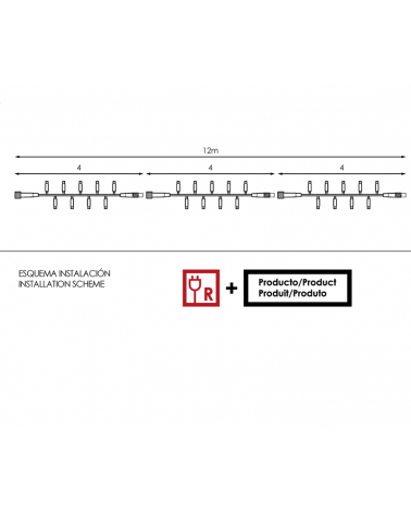 Guirnalda de 12 metros de longitud, empalmable, con 180 luces LED, cápsula clara. Se puede empalmar hasta 9 ó 10 cortinas (100 a 120 metros en total) con un solo enchufe. Está formada por 3 segmentos de 4m con 60 leds, que pueden funcionar de forma independiente. Apto para exteriores (IP65). Disponible con cable blanco o verde oscuro.