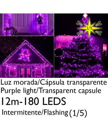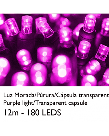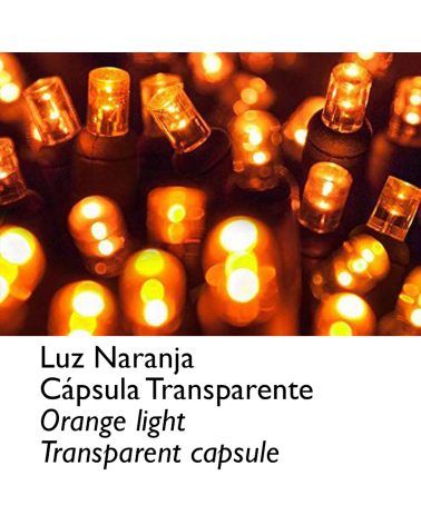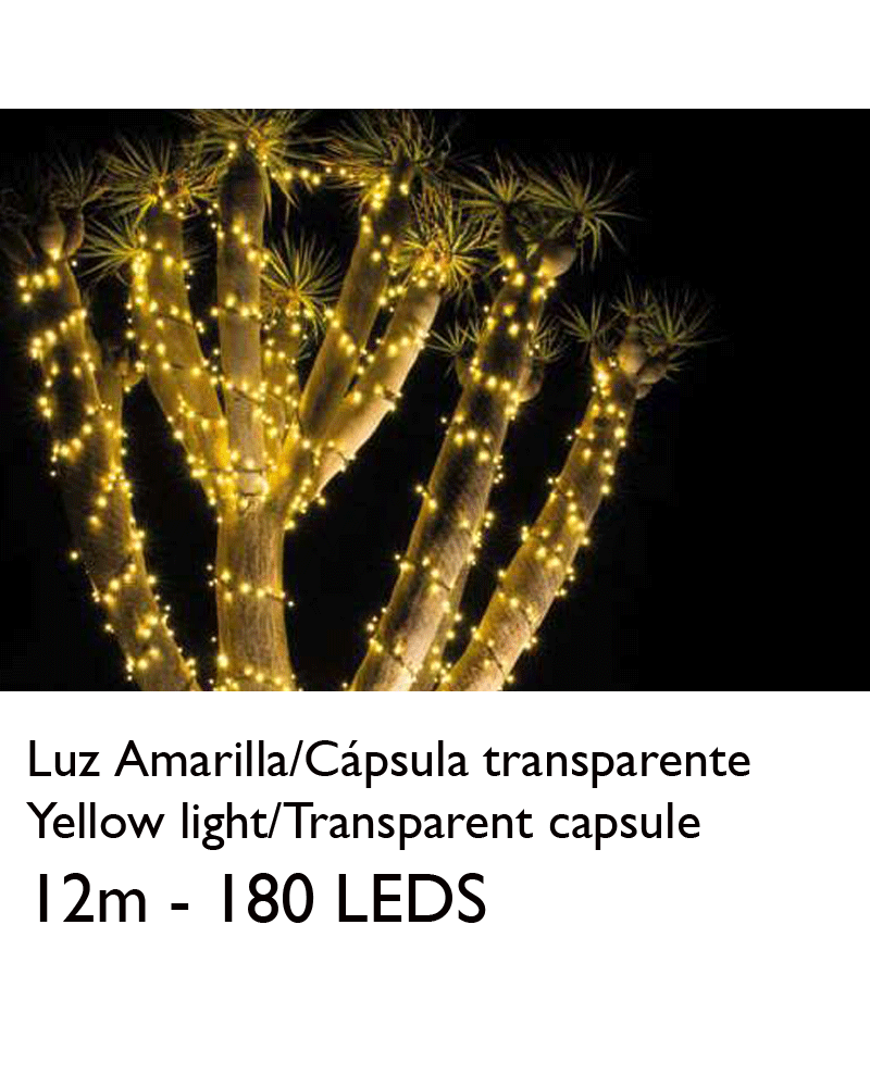 Guirnalda de 12 metros de longitud, empalmable, con 180 luces LED amarillo, cápsula clara. Se puede empalmar hasta 10 guirnaldas (100 a 120 metros en total) con un solo enchufe. Está formada por 3 segmentos de 4m con 60 leds, que pueden funcionar de forma independiente. Apto para exteriores (IP65).