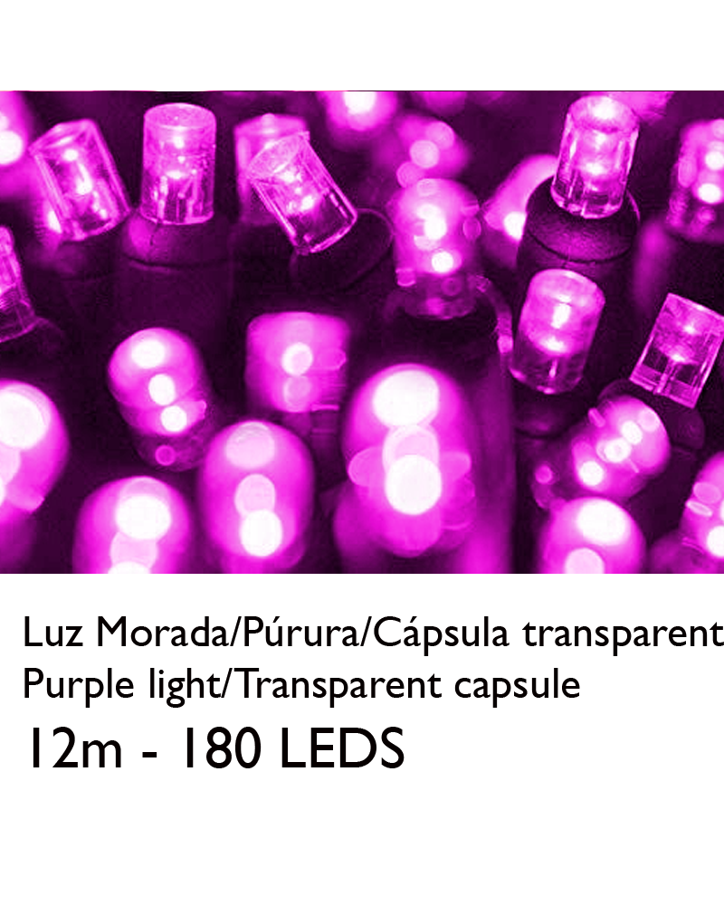 Guirnalda de 12 metros de longitud, empalmable, con 180 luces LED moradas o purpuras, cápsula clara, y cable morado. Se puede empalmar hasta 10 cortinas (100 a 120 metros en total) con un solo enchufe. Está formada por 3 segmentos de 4m con 60 leds, que pueden funcionar de forma independiente. Apto para exteriores (IP65).