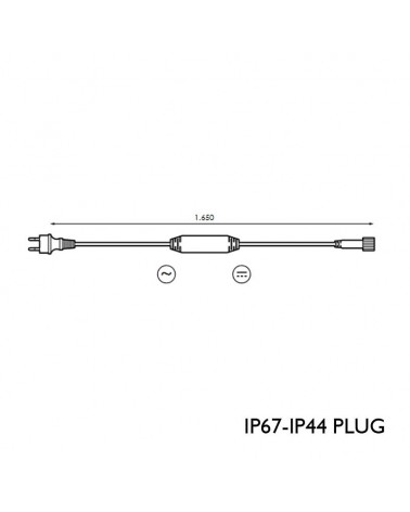 Cable alimentación 165cms 230V para guirnaldas LED. Color negro. Incorpora rectificador LED. - Conexión: smart-link - Medidas: largo 1,65 metros - Color: negro. 30Vac Max. 480W CII IP44 Plug IP67 Conector.