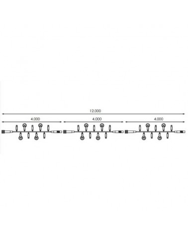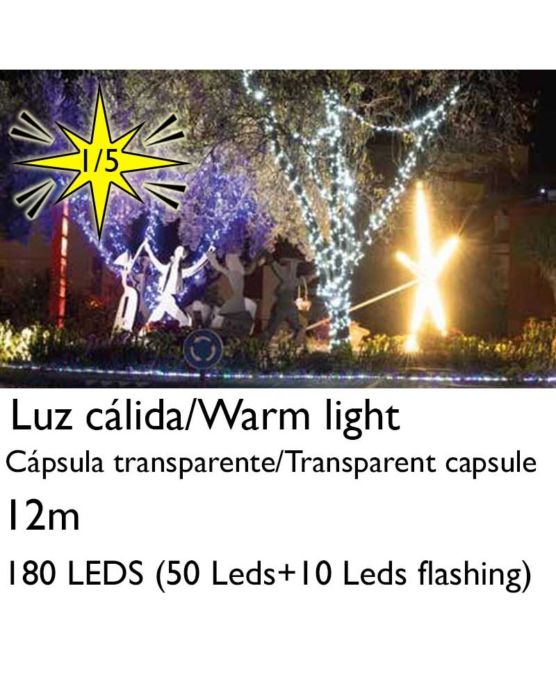 Guirnalda de luces LED de uso profesional, disponible con cable verde oscuro o blanco y ofrece una luz cálida. Apto para exteriores. Mide 12 metros de largo. Con un total de 180 luces Leds, 30 de ellos con efecto intermitente. Está formada por 3 segmentos de 4m con 60 leds (50 luz fija y 10 luz intermitente).