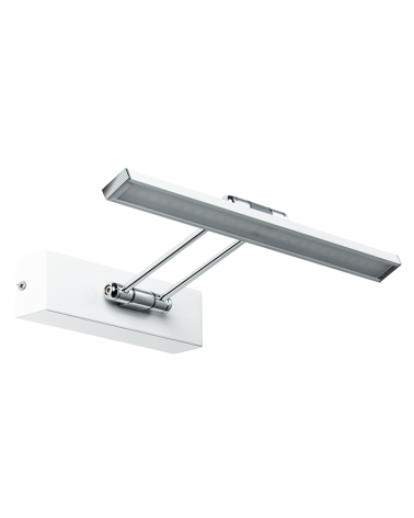 Iluminación de cuadros 29 cm LED 5W LED 2700K fabricado en metal, acabado en blanco y cromo. Se monta directamente sobre la imagen y se ajusta mediante dos bisagras para una perfecta iluminación. Ideal para iluminación uniforme de cuadros, mediante una luz blanca cálida.
