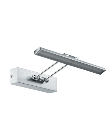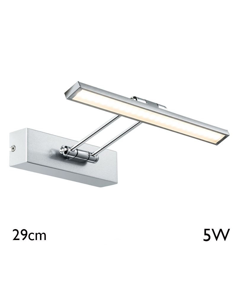 Iluminación de cuadros 29 cm LED 5W LED 2700K fabricado en metal, acabado en níquel y cromo. Se monta directamente sobre la imagen y se ajusta mediante dos bisagras para una perfecta iluminación. Ideal para iluminación uniforme de cuadros, mediante una luz blanca cálida.