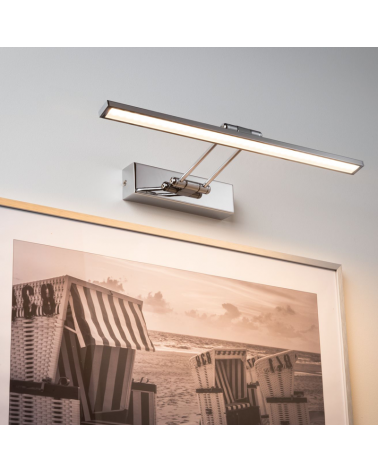 Iluminación de cuadros 45 cm LED 7W LED 2700K fabricado en metal, acabado en cromo. Se monta directamente sobre la imagen y se ajusta mediante dos bisagras para una perfecta iluminación. Ideal para iluminación uniforme de cuadros, mediante una luz blanca cálida.